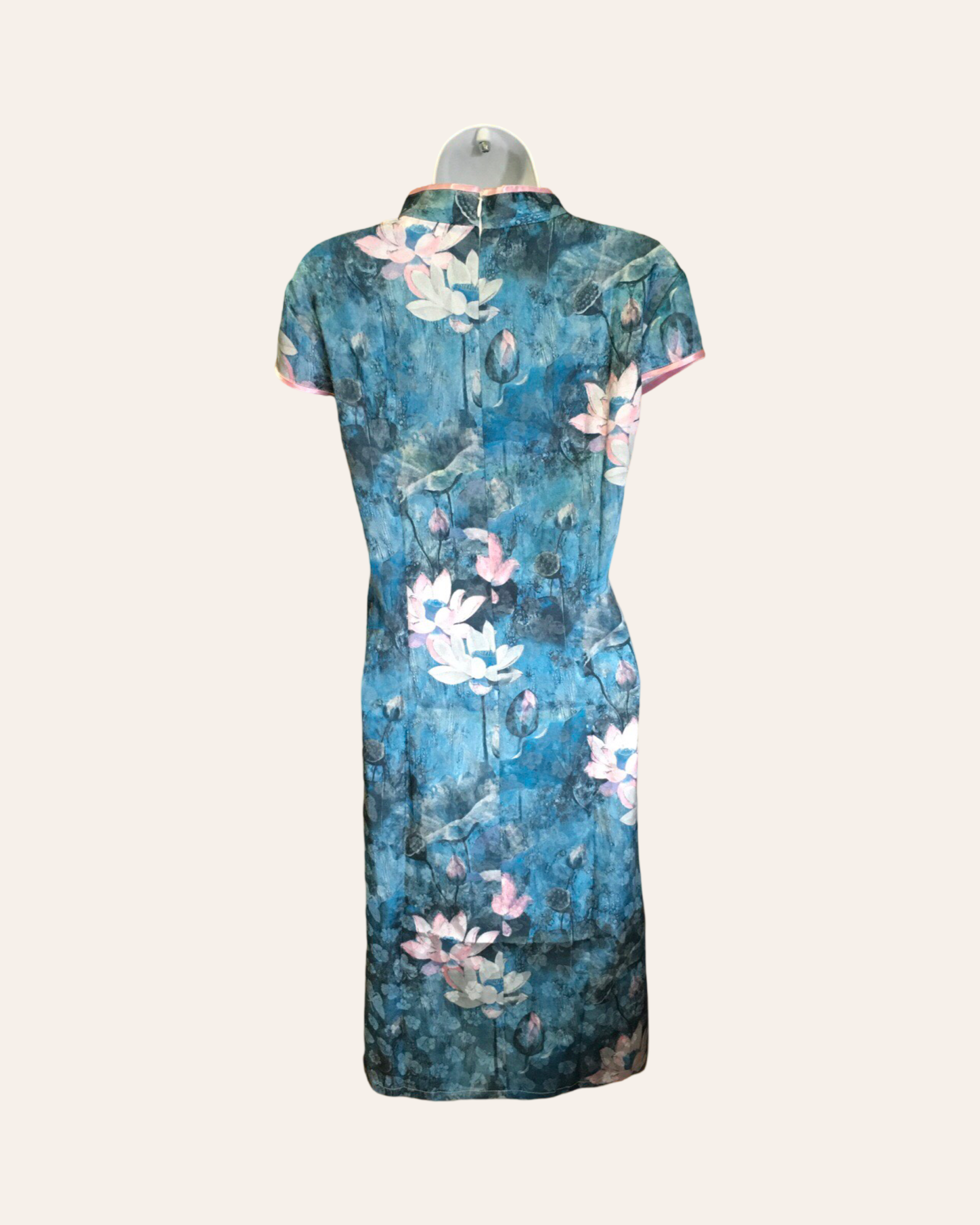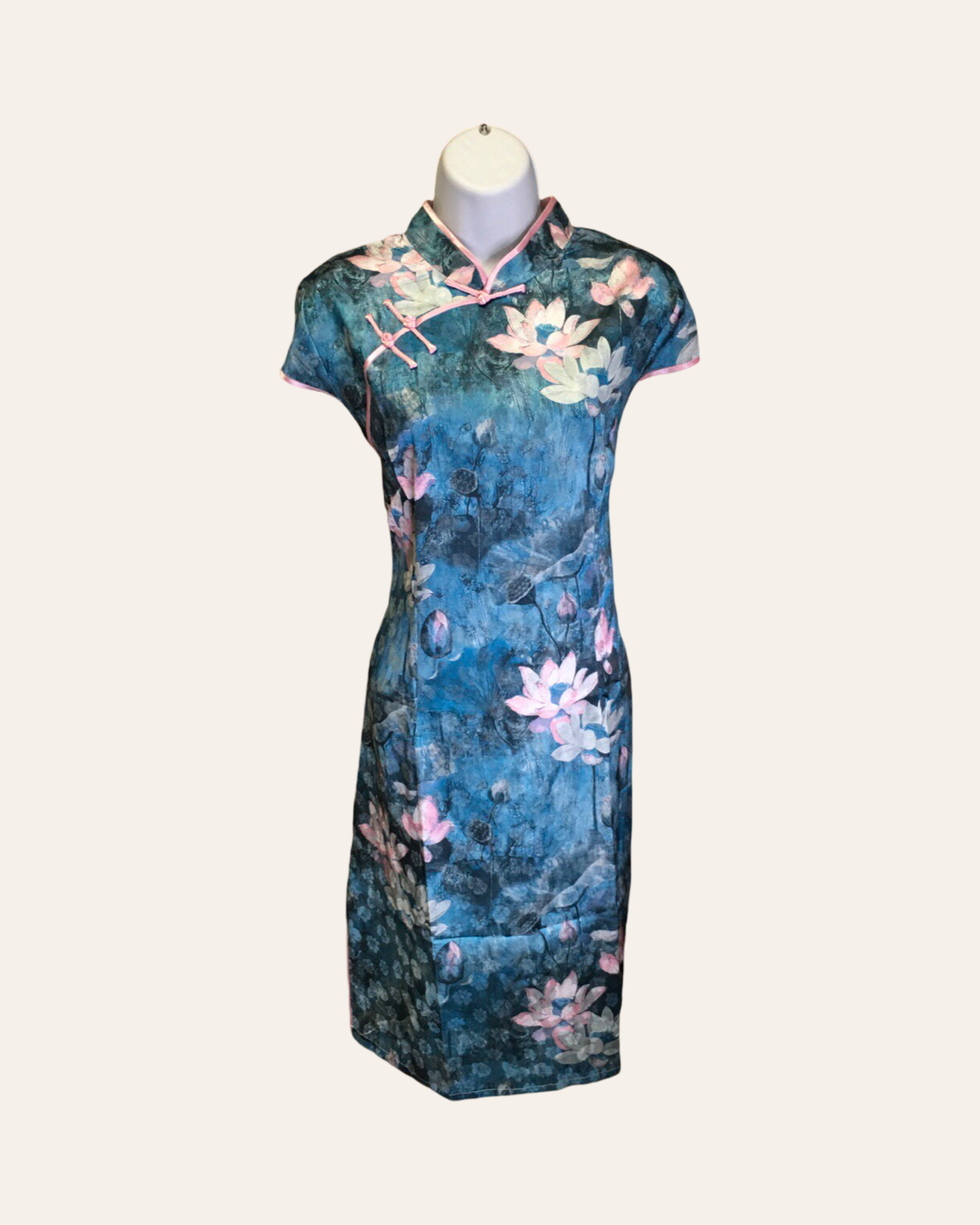 This stylish blue dress with pink accents features a unique, short Chinese traditional design. The high neck dress is adorned with delicate lily pads and frog clips on the side, adding an elegant touch to any occasion. Embrace sophistication and exclusivity with this beautiful piece.