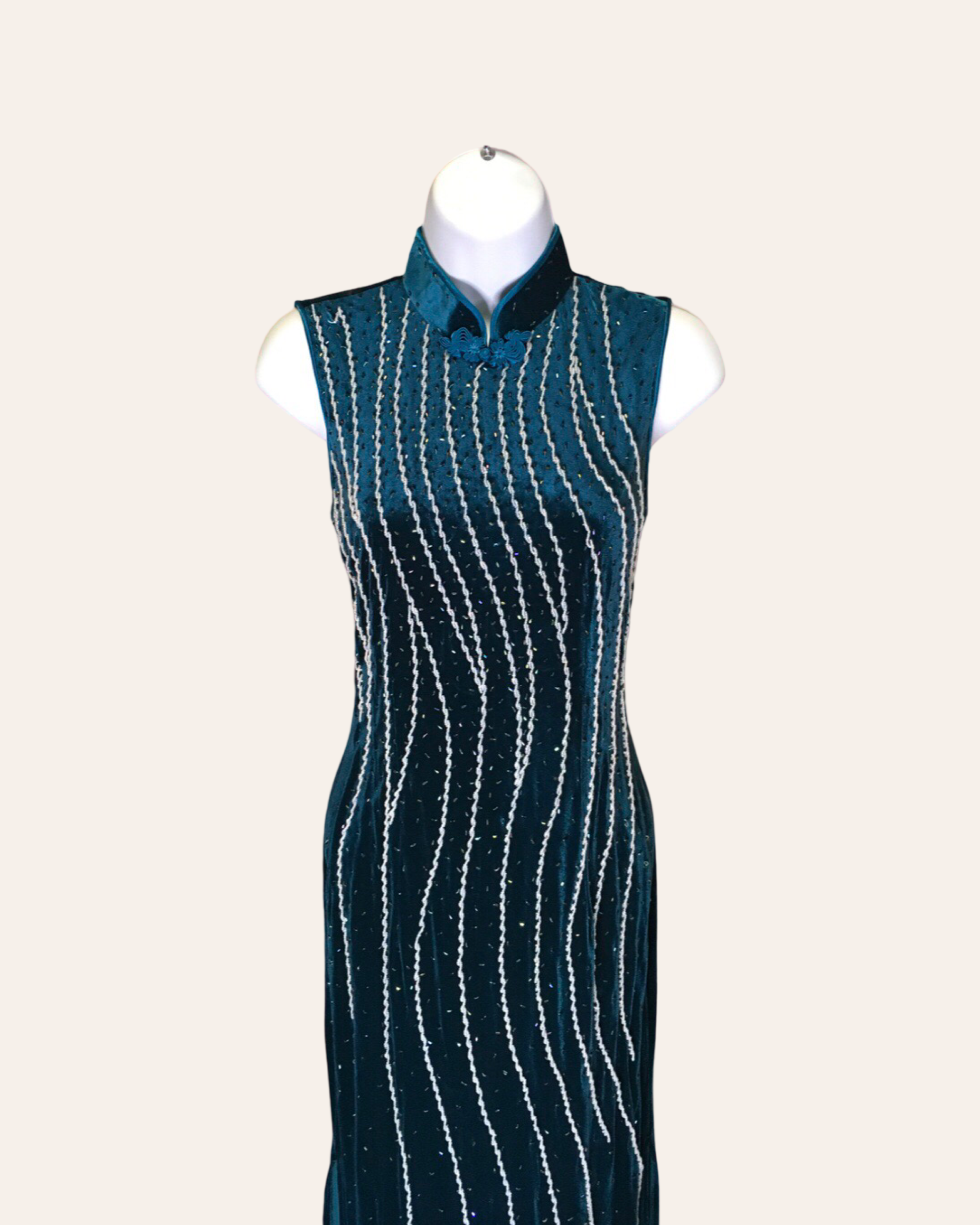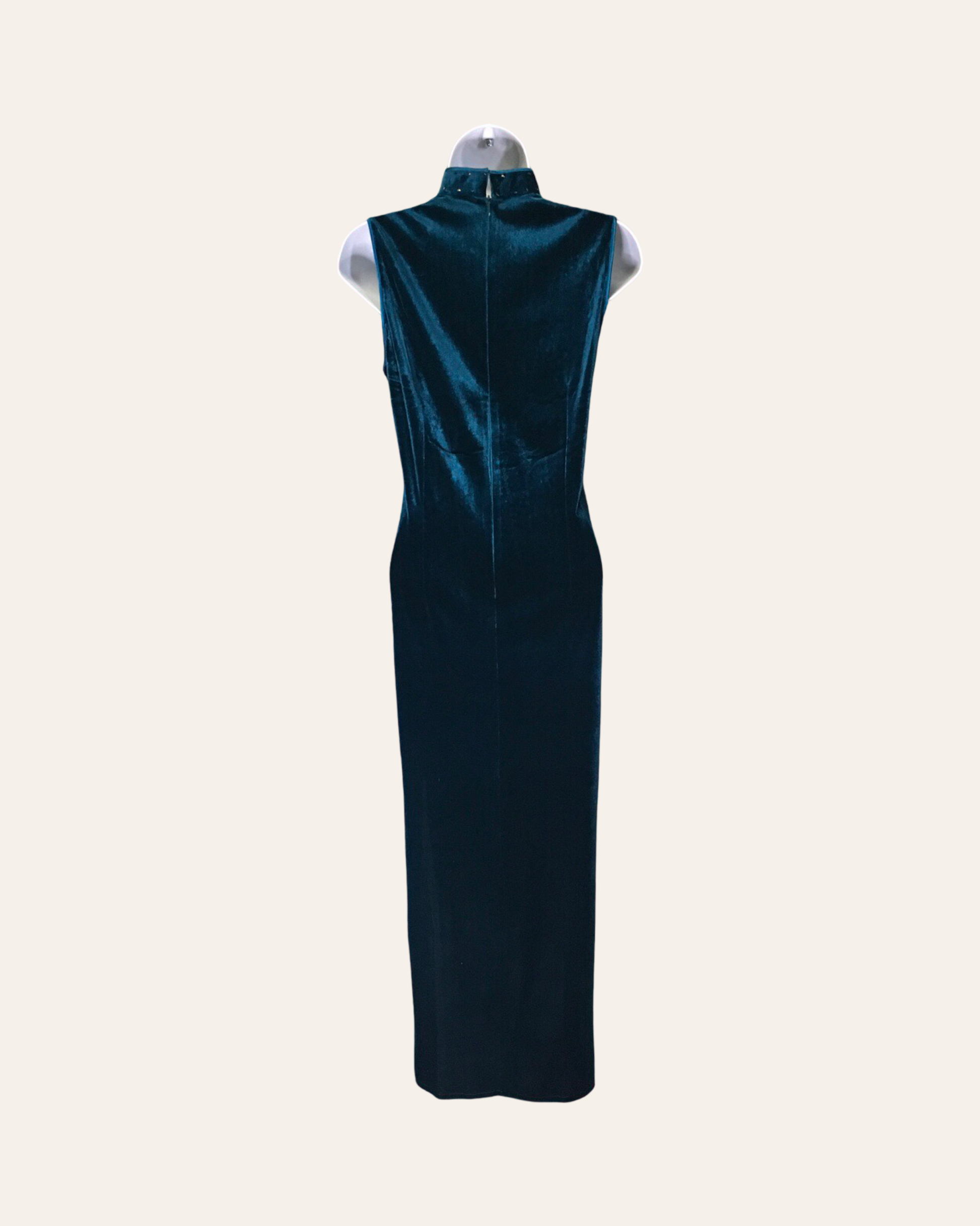This exquisite traditional Chinese dress is crafted from luxurious blue velvet, which drapes elegantly and catches the light with a sumptuous sheen. The dress is designed with a high, mandarin collar that frames the neck with regal sophistication, dancing its graceful silhouette. The absence of sleeves highlights the elegant lines of the dress, offering a streamlined and refined look.