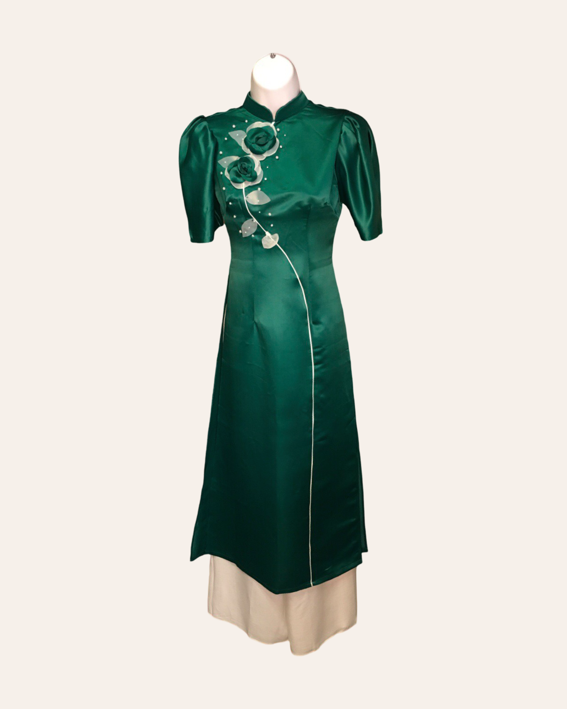 Elevate your fashion with our luxurious Emerald Silky Ao Dai Dress. The intricate flower design on the front, along with the voluminous puff sleeves, exude sophistication. The dress comes with white Ao Dai pants, completing the look of elegance and exclusivity. Indulge in the world of art and fashion with this premium dress.