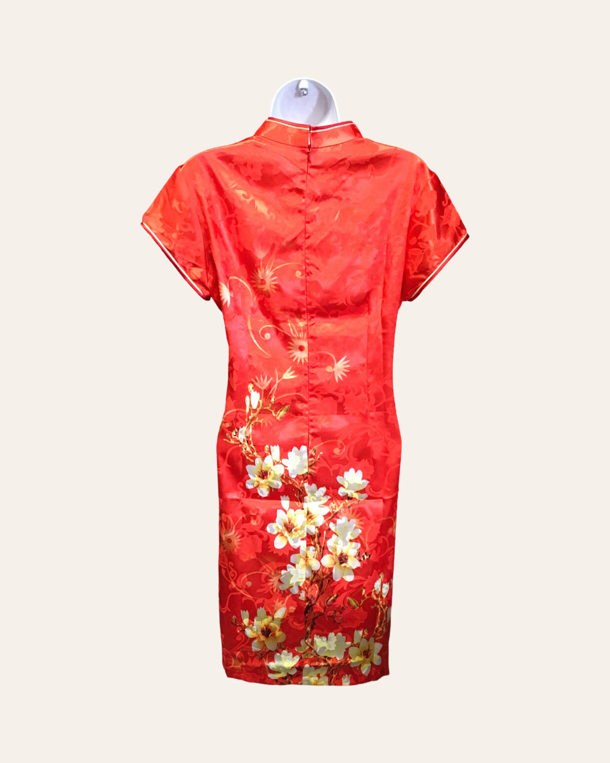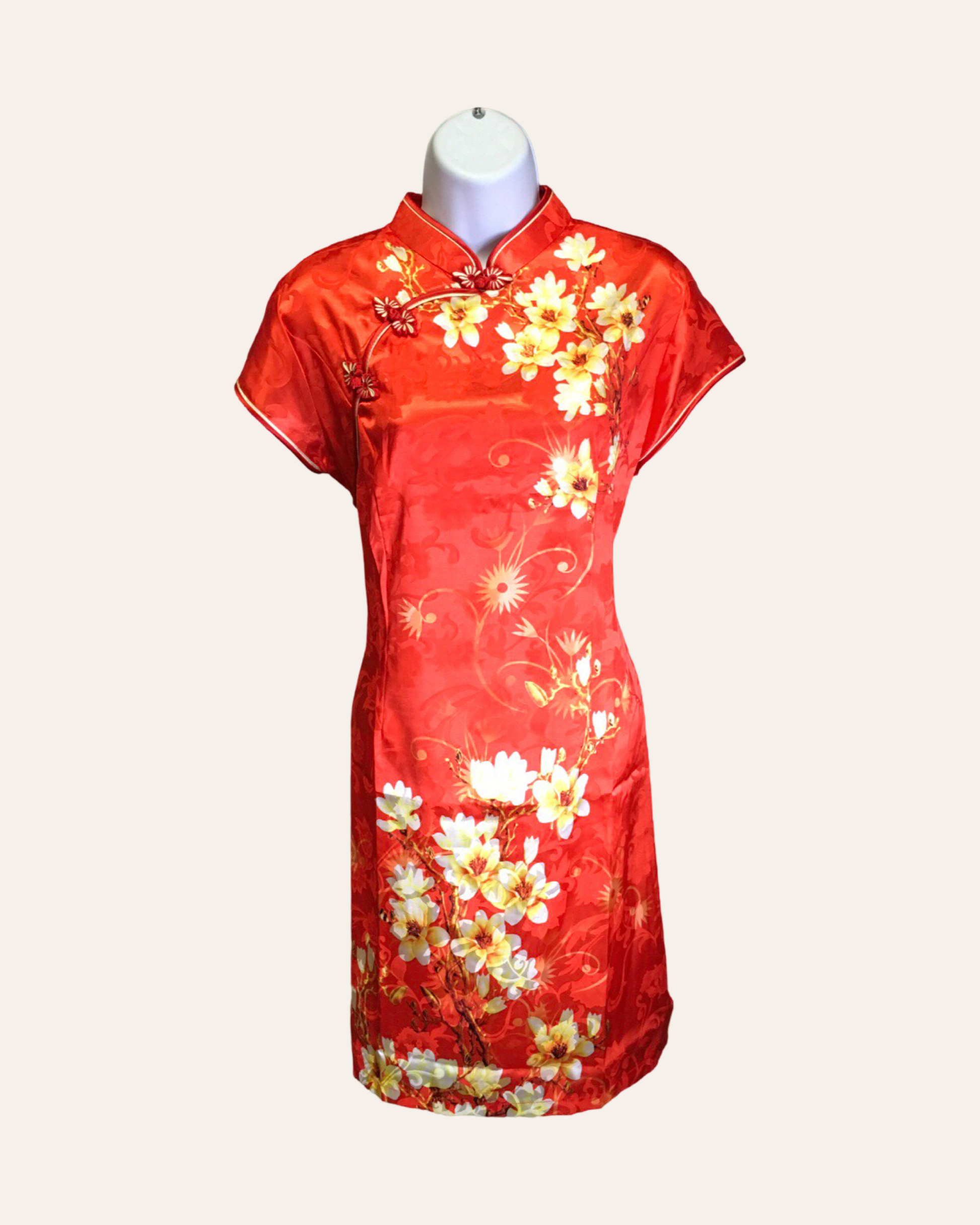 Indulge in the elegance of our high neck Chinese dress, featuring exquisite frog clasps on the sides. Made with luxurious red fabric adorned with delicate flower designs, this short traditional dress is perfect for special occasions. Upgrade your wardrobe with this exclusive and sophisticated piece.