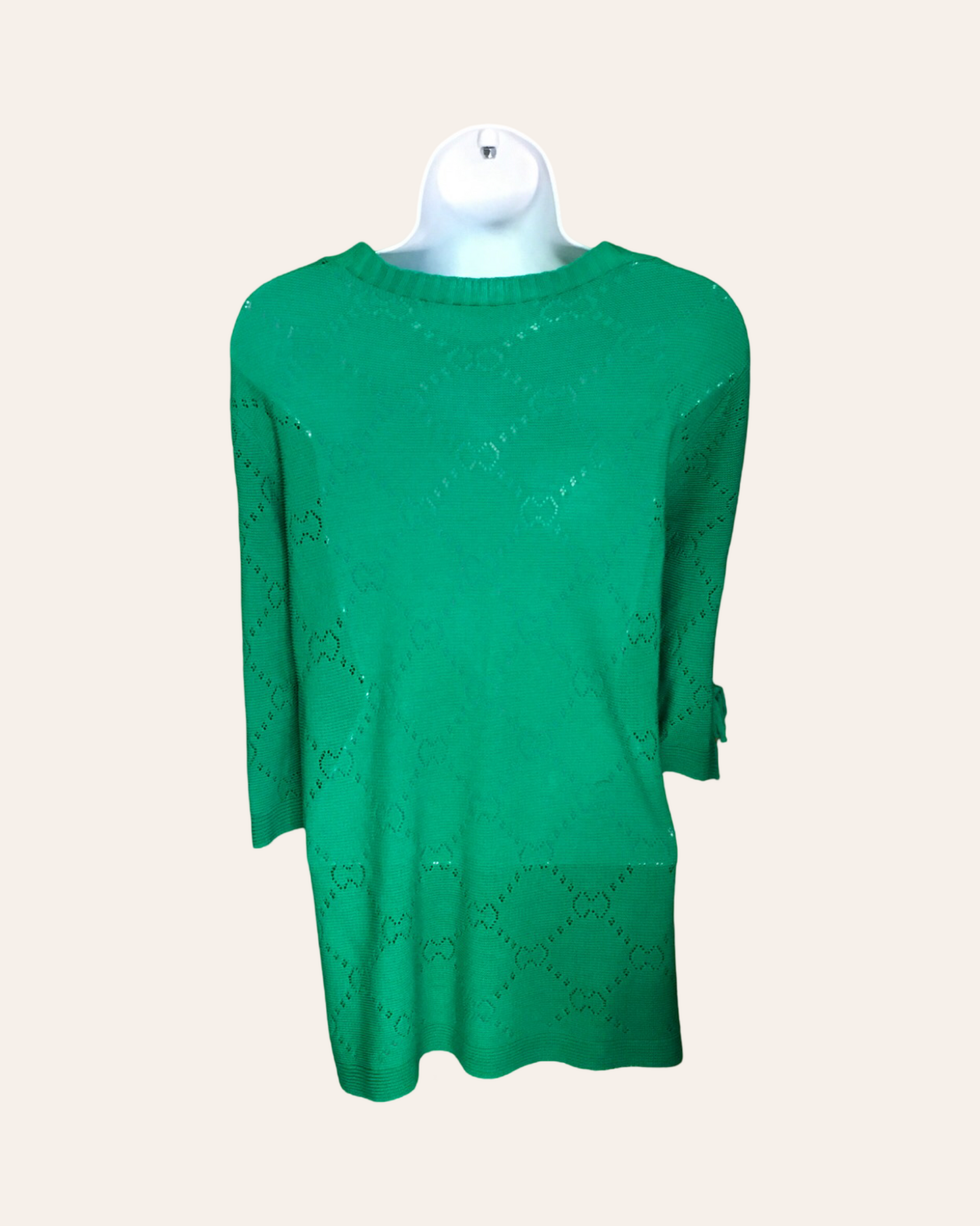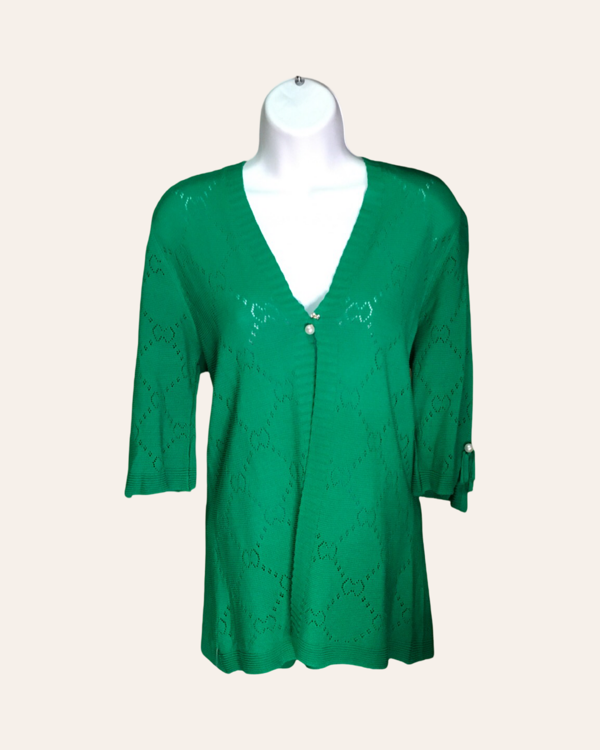 Be effortlessly chic and elevate your wardrobe with our Green Pattern Cardigan. Adorned with a delicate rhombus pattern and accented with a v neck, this cardigan is a stylish addition to any outfit. The pearl clasps at the top and on the sleeves add a touch of sophistication, making it the perfect choice for any occasion. With 3/4 sleeves, it's a comfortable and stylish choice for any season.