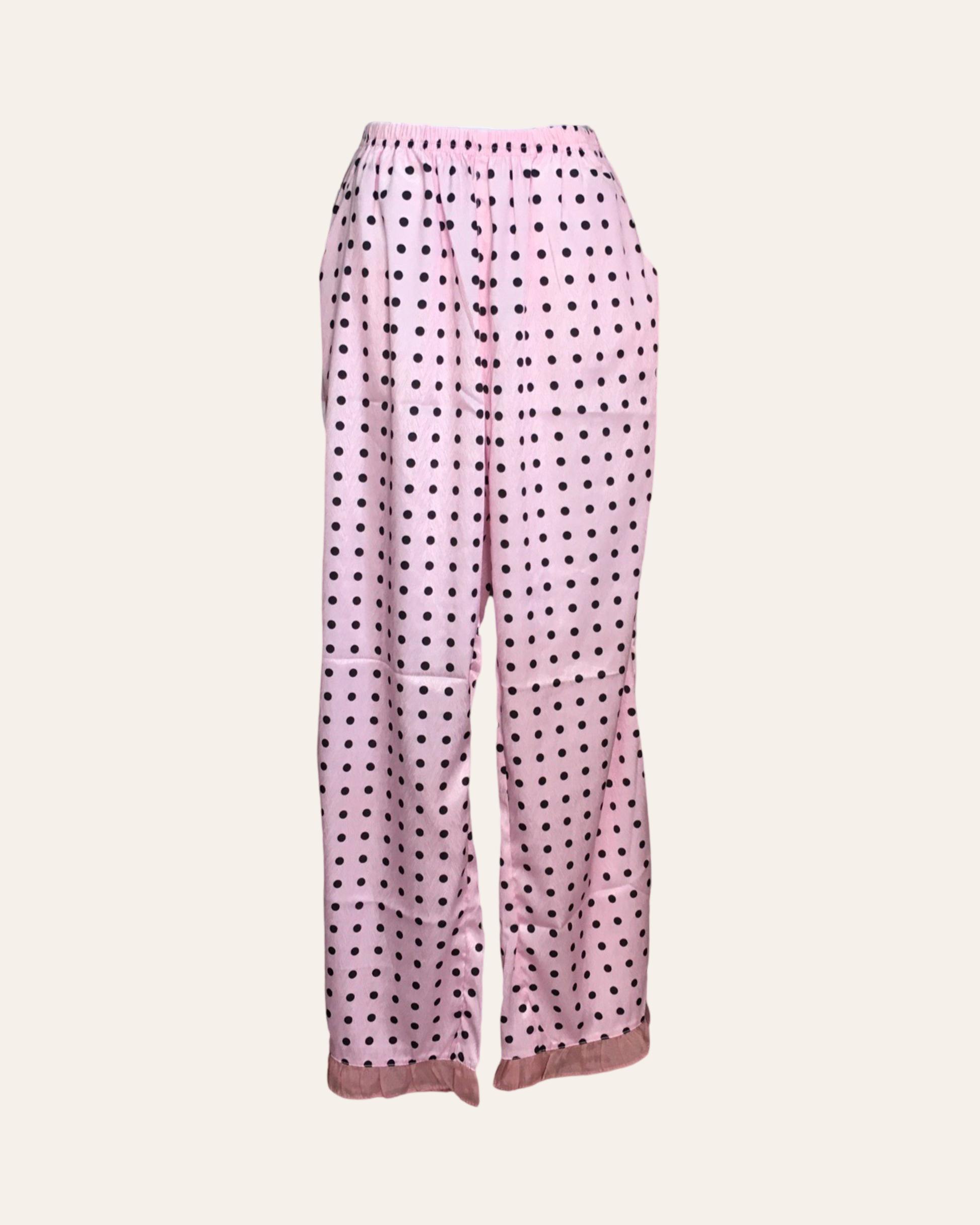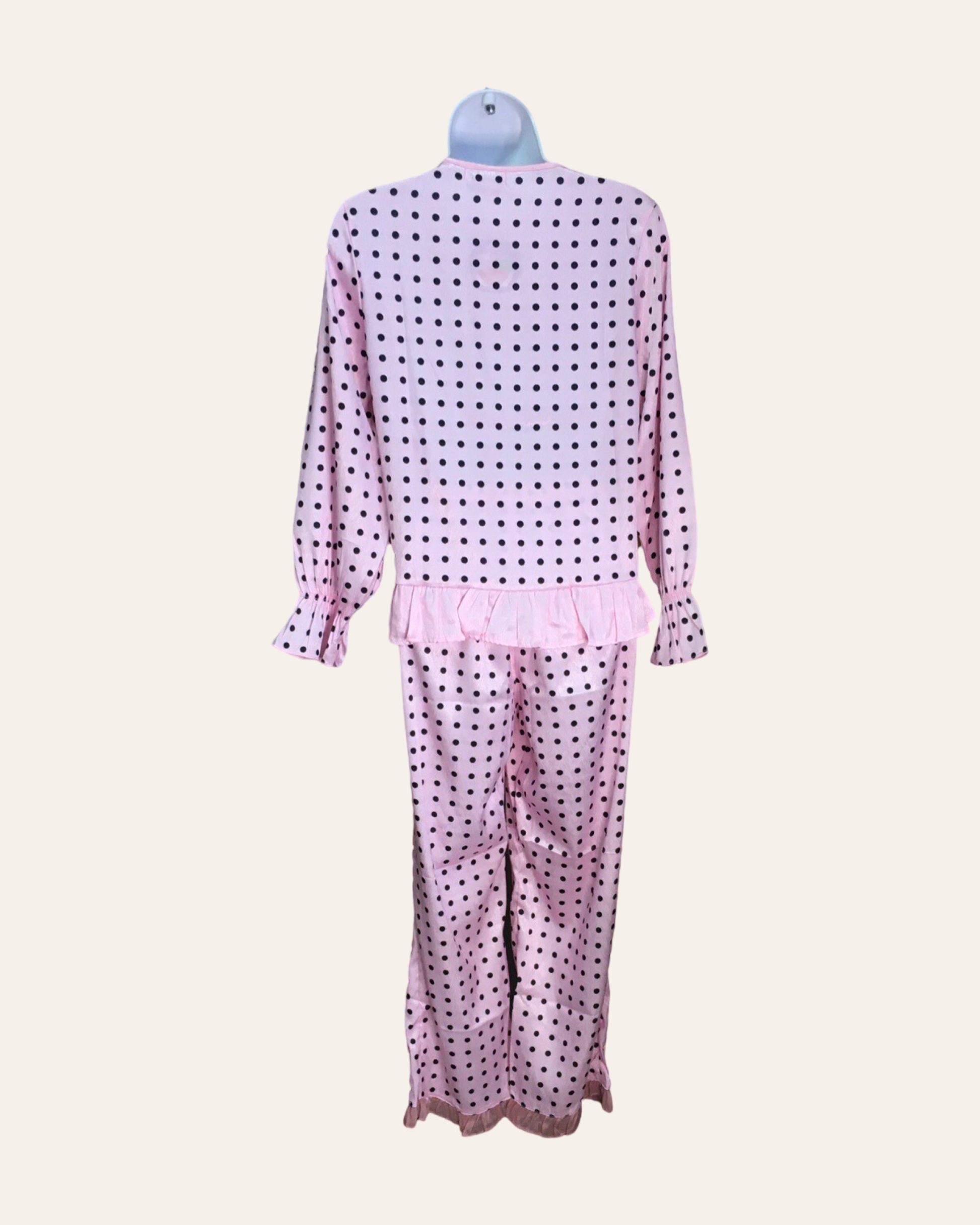 Get ready to prance around in style with our Pink Polka Dot PJ set. Featuring a ruffled collar and button up closure, you'll feel like a diva even while you sleep. Plus, pockets for storing your essentials. Don't just dream about it, add this quirky and fun set to your wardrobe now!