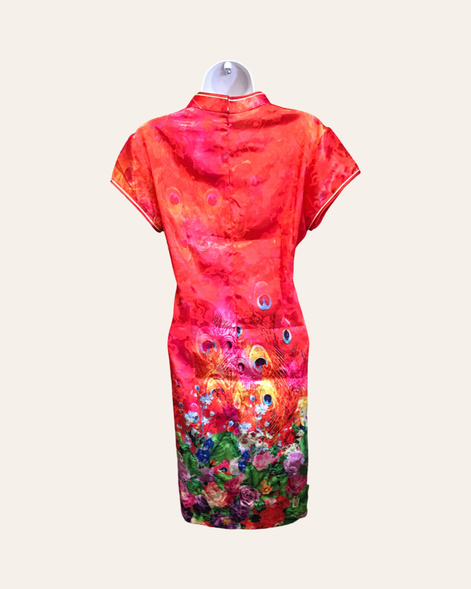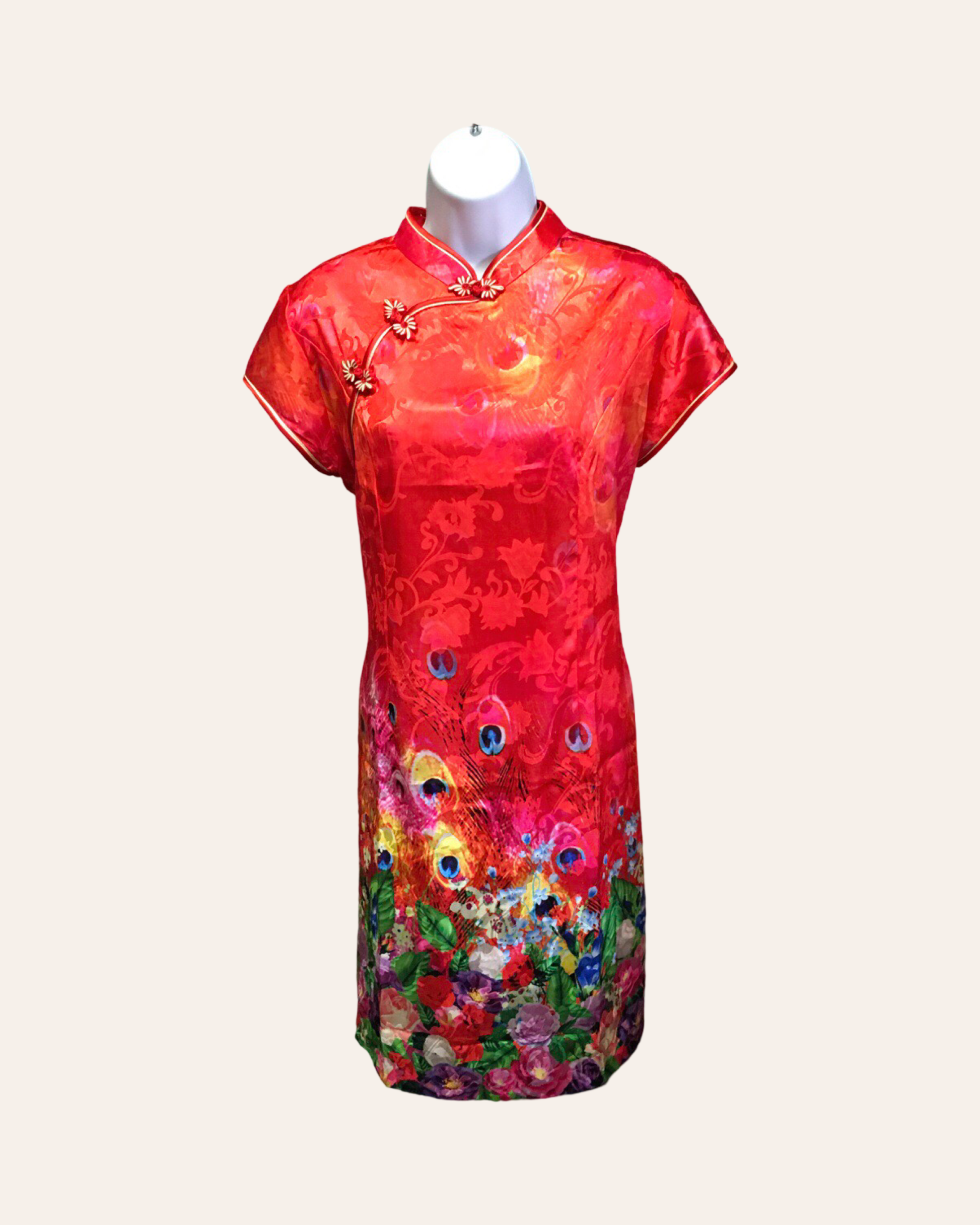 Elevate your wardrobe with this exquisite high-neck traditional dress, a masterpiece of elegance and cultural heritage. Featuring delicate frog clasps on the side, this dress combines meticulous craftsmanship with a refined silhouette. The striking design is beautifully adorned with intricate peacock and floral embroidery at the hem, creating a captivating display of nature's grace and beauty. The peacocks, with their resplendent plumage, symbolize grace and dignity, while the blooming flowers add a touch of timeless romance. This dress is a perfect blend of classic sophistication and artistic charm, ideal for any occasion where you wish to make a lasting impression.