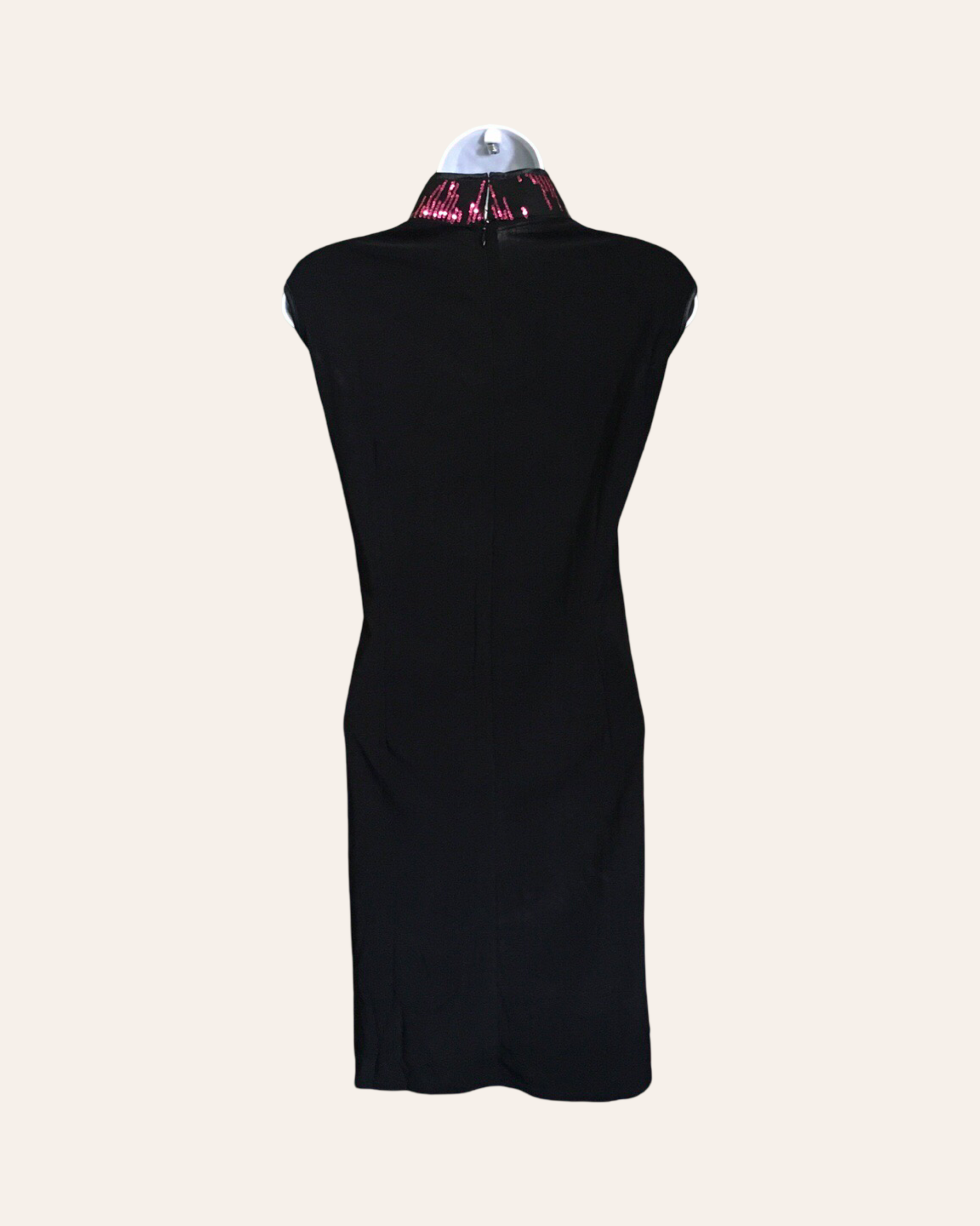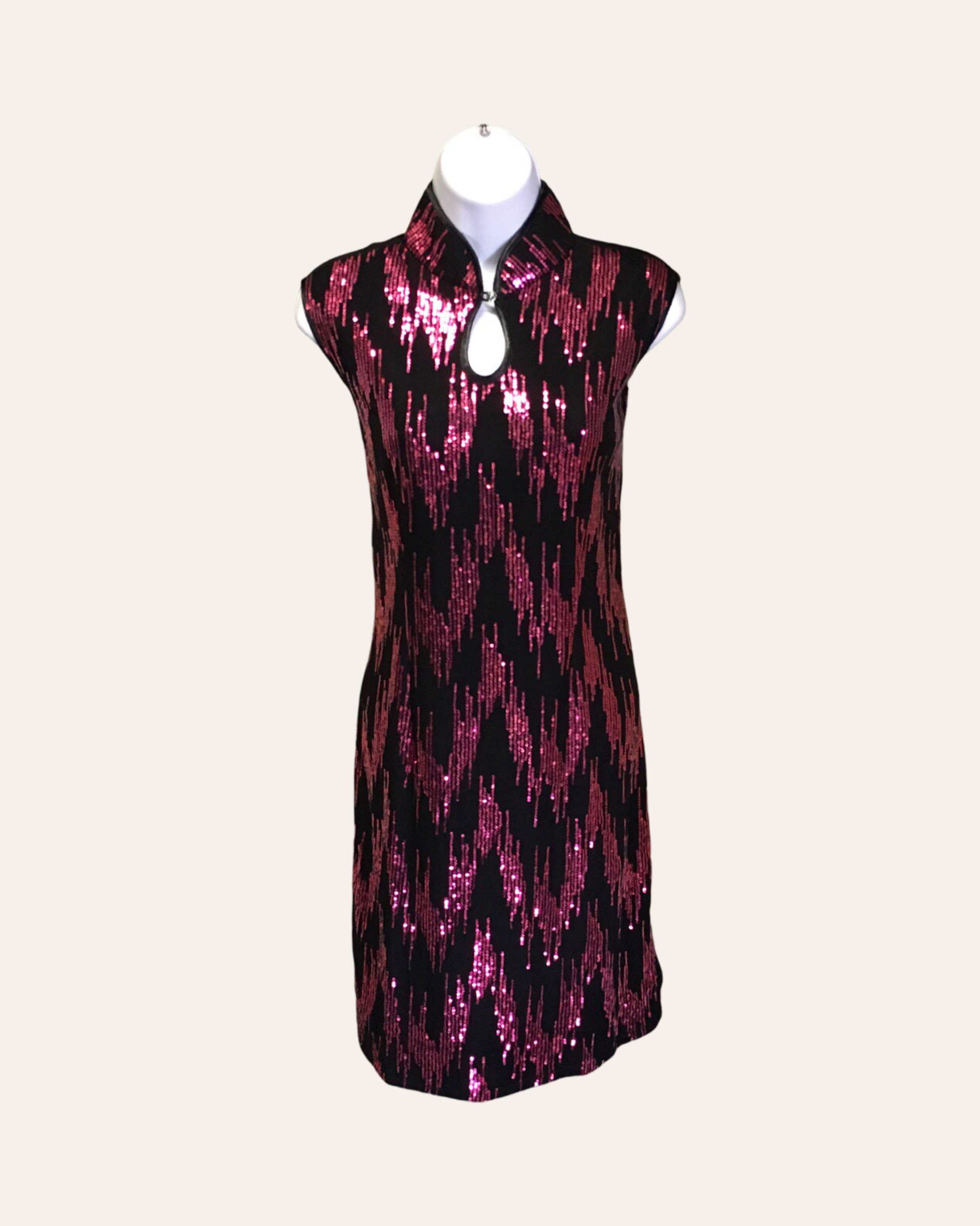 This striking Chinese traditional dress seamlessly blends classic sophistication with modern flair. Crafted from luxurious black fabric, the dress is adorned with mesmerizing pink zigzag sparkles that catch the light with every movement, adding a touch of contemporary glamour to its timeless design. The high neck and fitted silhouette accentuate the graceful lines of the dress, while the dramatic cutout in the middle introduces an element of bold, artistic allure. Perfect for making a statement at any formal occasion, this dress embodies the harmonious fusion of tradition and innovation.