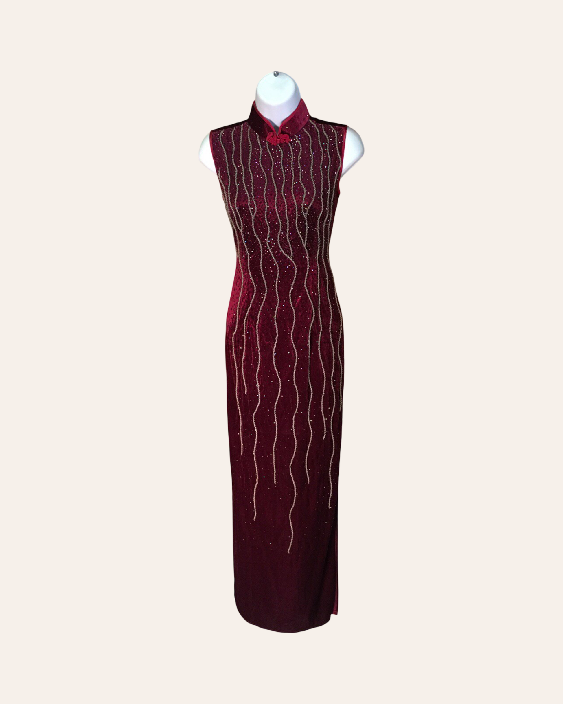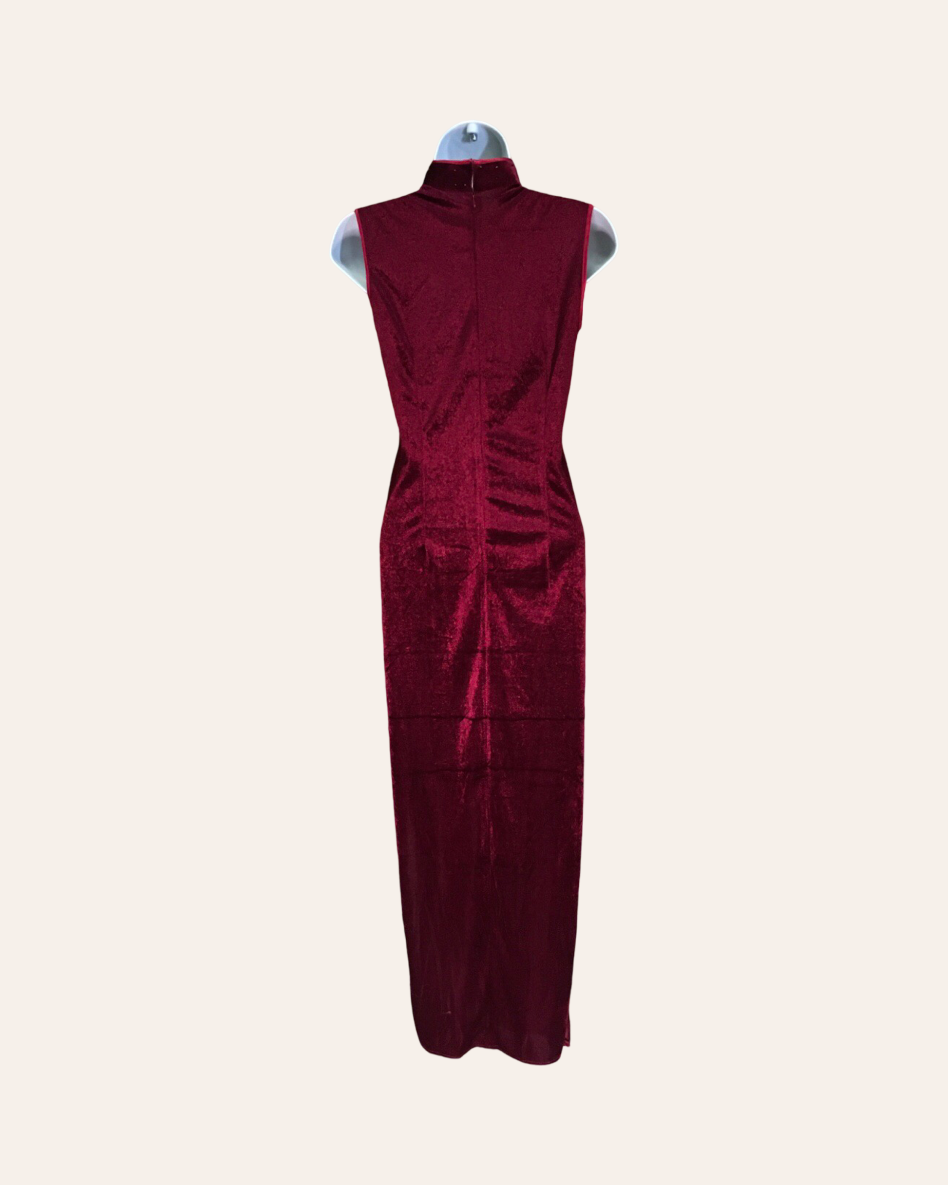 This exquisite traditional Chinese dress is crafted from luxurious red velvet, which drapes elegantly and catches the light with a sumptuous sheen. The dress is designed with a high, mandarin collar that frames the neck with regal sophistication, enhancing its graceful silhouette. The absence of sleeves highlights the elegant lines of the dress, offering a streamlined and refined look.