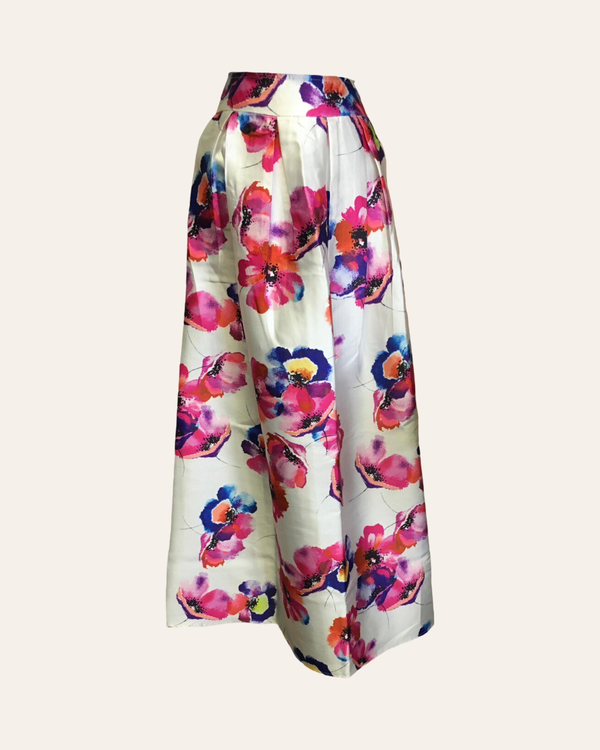 Indulge in luxury with our 2-piece set. Featuring a delicate spaghetti strap top and a flowing long skirt, both adorned with a colorful flower pattern. Effortlessly elegant with convenient zip up closures. Upgrade your wardrobe with this sophisticated and exclusive addition.