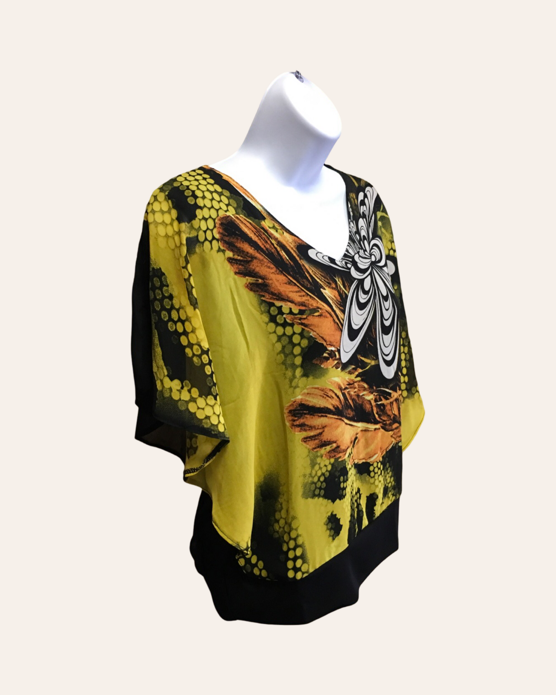Elevate your style with this striking black blouse, adorned with a vibrant yellow feather pattern that adds a bold and exotic touch. The blouse features a sophisticated V-neckline at the front, enhancing its elegant silhouette. The back also boasts a V-neck design, but with a chic twist: it’s partially closed with delicate lace fabric that adds a layer of intrigue and refinement. The batwing sleeves provide a relaxed, flowing fit that drapes beautifully, creating a flattering and graceful shape. Perfect for making a statement at both formal and casual events, this blouse pairs effortlessly with tailored trousers or a sleek skirt, offering a unique blend of boldness and elegance.